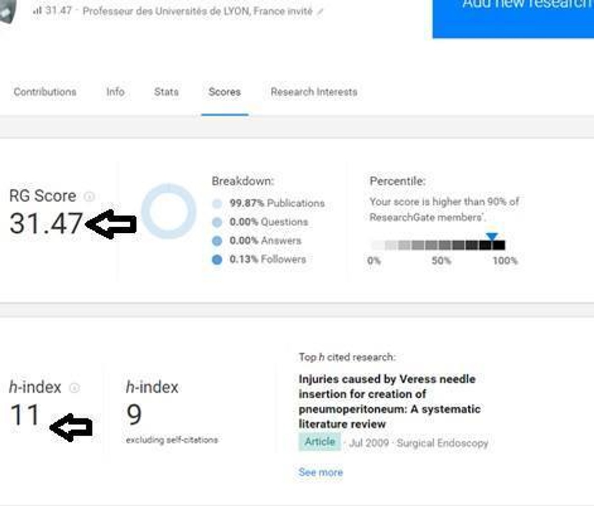 Em março de 2016, o Researchgate apresentou uma nova métrica nos perfis dos pesquisadores, o índice H, ambos completos e excluindo auto-citações. Isso representa um esforço para a plataforma e coloca a rede como um forte concorrente em relacionamento com outras fontes, como o Google Scholar, que também oferece o índice h, mas não permite seu cálculo, eliminando autocitações. Atualmente, o único banco de dados bibliográfico que tem essa funcionalidade é Scopus. Este indicador, juntamente com o crescente número de pesquisadores e publicações fazem do RG uma ferramenta poderosa para avaliação científica.
